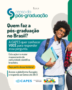 O Censo de Pós-Graduação começou, o período para responder o censo é de 03 de dezembro de 2025 a 26 de fevereiro de 2026. Alunos, docente, pesquisadores em estágio pós-doutoral e coordenadores deverão realizar o preenchimento de forma individual na Plataforma Sucupira.